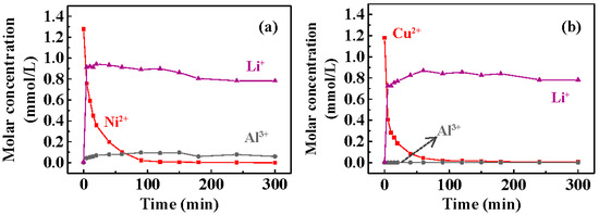 The concentrations of Li+ and Al3+ during the recovery of Ni2+/Cu2+ were measured to determine the leaching of T400 as a function of time. Figure 7 plots the leaching concentrations of Li+ and Al3+ during the Ni2+ (Figure 7a) and Cu2+ (Figure 7b) recovery. Figure 7a shows that the Li+ concentration increased rapidly to ~0.9 mmole/L within 5 min of Ni2+ recovery, showing that Li+ was released from the calcined LDH rapidly. The concentration of Al3+ during the recovery of Ni2+ was 0.05−0.1 mmole/L. The rate of Li+ leaching in 5 min was faster than the rate of Ni2+ recovery, confirming Li+ leaching (Equation (4)) followed by Ni2+ recovery (Equation (5)). In the later stage, the Li+ concentration was stable. Figure 7b shows that Li+ concentration increased rapidly to ~0.8 mmole/L within 5 min of Cu2+ recovery. Al3+ was barely detected (<0.1 mg/L).