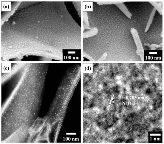 Figure 8 presents microstructural observations of T400 after Ni2+ recovery and its derived nano-catalyst. Figure 8a displays the SEM surface image of T400 after Ni2+ recovery. The Ni-containing product observed in Figure 8a comprises dense filaments with a width of ~10 nm, uniformly covering the platelet surface. The elemental composition of T400 after the recovery of Ni2+/Cu2+ and H2 reduction as determined by SEM-EDS is presented in Table 2. As shown in Table 2, for the T400 after Ni2+ recovery for 5 h, EDS elemental analysis revealed a nickel content of 4.45 at.%. In addition, a trace amount, 0.37 at.%, of sulfur was detected on the Ni-containing product. The sulfur content decreased to very little intensity to detect after H2 reduction treatment for 3 h. Figure 8b–d display SEM and TEM observations of the Ni-containing product on T400 after H2 reduction treatment for 3 h. As shown in the SEM surface image of Figure 8b, the reduced Ni-containing product comprises nanoparticles with diameters of ~10 nm, densely and uniformly dispersed on the platelet surfaces. Figure 8c shows the TEM-HAADF image of the reduced Ni-containing product. The TEM-HAADF images revealed the Z contrast of the samples. Figure 8c shows bright nanoparticles densely dispersed on the platelet surfaces, revealing that the nanoparticles contain nickel. Figure 8d displays the HRTEM image of some nanoparticles. The nanoparticles have a d-spacing of 0.203 nm, corresponding to the Ni (111) plane.