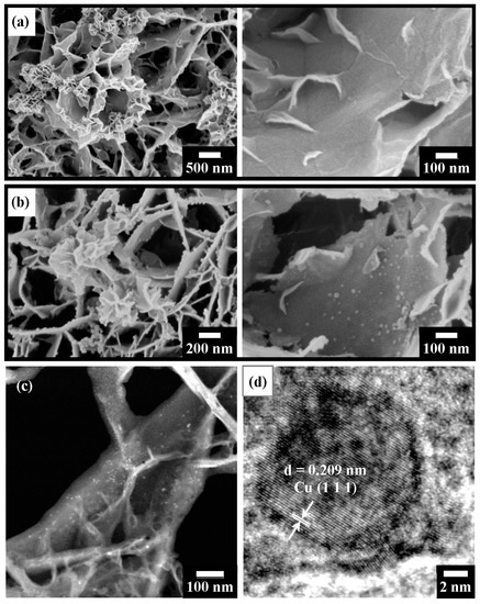 Figure 9 shows observations of the microstructure of T400 after Cu2+ recovery and its derived nano-catalyst. The Cu-containing product (shown in Figure 9a) exhibits various morphologies, which can be classified into two types. One is nanoflower-like and is found at the edges of the platelets (left-hand image of Figure 9a); the other consists of nanoplatelet-like structures with a width of ~100 to 300 nm, formed on the platelet surface (right-hand image of Figure 9a). EDS elemental analysis (Table 2) reveals that the copper content was 5.36 at.%. The sulfur content of the Cu-containing product was 2.23 at.%, which was higher than that of the Ni-containing product. It decreased to 1.14 at.% after H2 reduction treatment for 1 h. The reduced Cu-containing product (shown in the SEM images in Figure 9b) after a reduction time of 1 h comprised nanoparticles of various sizes. As shown in the left-hand image of Figure 9b, relatively large particles (~35 nm in diameter) were primarily found at the edges of the platelets, with a few on the platelet surfaces. In the right-hand image of Figure 9b, relatively small nanoparticles with about 10–25 nm diameters are observed on the platelet surfaces. Figure 9c shows the TEM-HAADF image of the reduced Cu-containing product. Figure 9c shows bright nanoparticles dispersed on the platelet surfaces, revealing that the nanoparticles contain copper. The HRTEM image (Figure 9d) presents a nanoparticle with a diameter of ~15 nm. The nanoparticle has a d-spacing of 0.209 nm, corresponding to the Cu (111) plane.