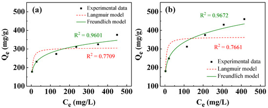 where Ce (mg/L) is the concentration of adsorbate at equilibrium; Qe (mg/g) is the amount of adsorbate adsorbed per unit weight of adsorbent at equilibrium; Qm (mg/g) is the maximum adsorption capacity; kL (L/mg) is the Langmuir constant related to adsorption energy; and kF (mg/g·(L/mg)1/n) and n are Freundlich constants related to adsorption capacity and adsorption intensity, respectively. The Langmuir isotherm describes that all specific adsorption sites have homogeneous adsorption capacity to adsorbates, whereas the Freundlich isotherm model assumes that adsorption sites are heterogeneous [60,62,65]. Figure 10 presents the isotherms of adsorption of Ni2+/Cu2+ using T400. As shown in Figure 10a, the amount of Ni2+/Cu2+ adsorbed increased with initial concentration. At the maximum initial cation concentration of 600 mg/L, the removal capacities of Ni2+ and Cu2+ were 376.1 and 460.2 mg/g, respectively. Table 3 presents the isotherm adsorption parameters. As shown in Table 3, the Freundlich model fits better than the Langmuir model for both Ni2+ and Cu2+, suggesting that the active adsorption sites for Ni2+/Cu2+ of the calcined Li–Al LDH were heterogeneously distributed, and the recovery of metal cations might have occurred on multiple molecular layers [65,66]. The Freundlich constants (n) exceed 1 (Table 3), indicating that the isotherms are favorable [62,67].