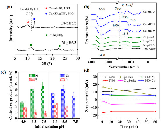 Characterization of the used T400 after the recovery of Ni2+/Cu2+ at various initial solution pH levels for 1 h: (a) XRD pattern; (b) FTIR spectra; (c) EDS elemental content on products; and (d) Zeta potentials of Li–Al LDH, gibbsite, and their calcination products in weakly acidic water (pH 5.0) as a function of time. The changes of T400 in Ni2+/Cu2+-containing aqueous solution with time are also shown. The initial Ni2+/Cu2+ concentration for the experiments was 75 mg/L.