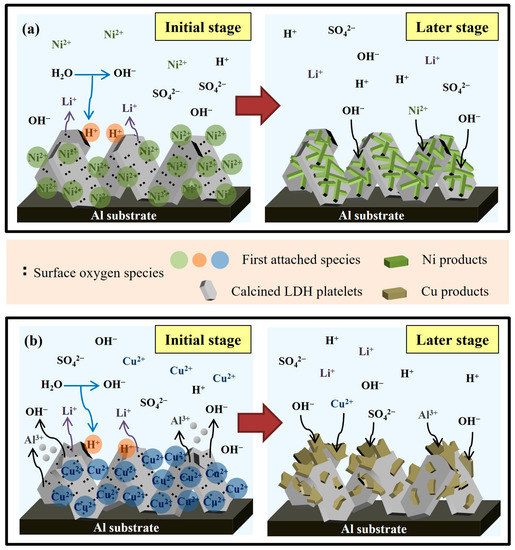 Figure 12 schematic represents the recovery mechanisms of Ni2+ (Figure 12a) and Cu2+ (Figure 12b) on calcined Li–Al LDH. Figure 12a schematically depicts the mechanism of Ni2+ recovery on calcined Li–Al LDH. As shown in the left-hand panel of Figure 12a, during the initial stage of recovery, some of the surface oxygen species immediately reacted with water and released OH−, increasing the solution pH (Equation (4)). Some other surface oxygen species bonded to Ni2+, rapidly reducing the Ni2+ concentration (Equation (5)). The initially adsorbed Ni2+ attracted OH− in solution electrostatically. In the later stage of recovery (right-hand panel of Figure 12a), the remaining Ni2+ gradually condensed with the high concentration of OH− around the platelet surfaces, growing into condensates of α–Ni(OH)2. Figure 12b schematically depicts the mechanism of Cu2+ recovery on calcined Li–Al LDH. Similar to Ni2+, Cu2+ is primarily bound to surface oxygen species in the initial stage of recovery (as shown in the left-hand panel of Figure 12b). Cu2+ may be corrosive to calcined Li–Al LDH, especially at the platelet edges, so some Al3+ and OH− were dissolved and released around the platelet surface. In the later stage of recovery (as shown in the right-hand panel of Figure 12b), Cu2+ precipitated or coprecipitated with Al3+, and the intercalation of sulfate groups accompanied this process into the metal hydroxide layers during the condensation.