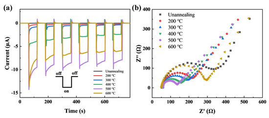 According to the above experimental phenomenon, the temperature is demonstrated to have non-negligible effects on the crystallinity and optical properties of copper oxide film [29]. We further optimized the annealing temperature for the PEC sensing photoelectrode. Photocurrent response curves and EIS were used to investigate the PEC activity of copper oxide film photoelectrode. Figure 2 shows that the cathodic photocurrent of the sample annealed at 500 °C is the largest, and the sample without annealing treatment has the smallest photocurrent, indicating that the photoactive material is a p-type semiconductor, and all the samples are photocathodes. After the photocurrent response measurement, these photocathodes were immediately transferred to 0.1 M KCl solution mixed with 1 mM K4[Fe(CN)6] and 1 mM K3[Fe(CN)6] to analyze the carrier transport dynamic. Figure 2b shows that the charge transfer resistance for the sample annealed at 500 °C is the smallest. The relationship of the transfer resistance agrees well with that of the photocurrent. The improvement in crystal quality can result in the reduction of defect density and enhancement of carrier concentration for the CuO film annealed at higher temperatures. Here, the heat treatment at 600 °C leading to a photocurrent smaller than that with heat treatment at 500 °C is related to the fact that the FTO substrate cannot withstand very high temperatures (e.g., 600 °C) [30]. Therefore, the annealing treatment temperature was optimized to be 500 °C for the following sensing measurements.
