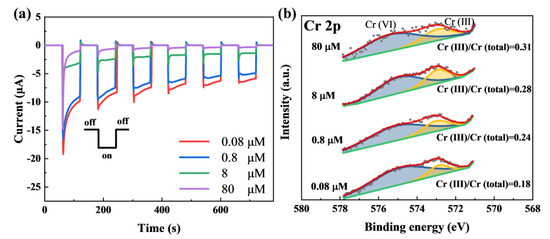 In order to confirm the sensing feasibility and reveal the sensing mechanism for PEC Cr(VI) sensing with the CuO film photocathode, we analyzed the surface composition of the different samples after being tested in different solutions. As illustrated in Figure 4a, when the Cr(VI) concentration gradually increases from 0.08 µM to 80 µM, the overall photocurrent at the same measuring time steadily decreases. The corresponding Cr 2p XPS peak in Figure 4b could be fitted into two main peaks: the one located at lower binding energy (573.1 eV) corresponds to Cr(III), and the other peak centered at higher binding energy (575.4 eV) originates from Cr(VI) [34,35]. It is obvious that the area ratio of the Cr(III) sub-peak to the total peak for the sample being tested in the higher-concentration Cr(VI) is larger than that in the lower-concentration Cr(VI), confirming the presence of more Cr(III) in the photocathode surface for the Cr(VI) solution with a higher concentration. Prior to PEC analysis, the nominal concentrations of the solutions were 2.0 µM and 0.2 µM, and the measured solution concentrations from inductively coupled plasma mass spectrometry (ICP–MS) were 1.916 µM and 0.208 µM, respectively. Following photocurrent response testing for the two photocathodes in the 10 mM tris HCl containing 2.0 µM and 0.2 µM Cr(VI), after the 10 min test, the chromium concentrations in the used solution decreased to 1.592 µM and 0.126 µM, respectively. We believe that there are two chemical reactions on the surface of the CuO film photocathode. The first one is the reduction of Cr(VI) to Cr(III), and the next reaction occurs when Cr(III) combines with the hydroxide in the solution to form Cr(OH)3. Upon illumination, photogenerated electrons are excited to the conduction band, producing positively-charged holes in the valence band of CuO, and the photogenerated electrons assist in reducing Cr(VI) to Cr(III) if they do not recombine. Related processes can be expressed by Equations (1–3):