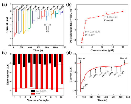 Selectivity and reproducibility are also key elements for designing a new sensor. The reproducibility is examined by fabricating tens of CuO film photoelectrodes with the same conditions and performing the amperometric experiments in background solutions with and without 1 µM K2Cr2O7. The averaged photocurrents for each sample are shown in Figure 5c, indicating that the photocurrent deviation for the two solutions is within ±15%. Anti-interference measures were performed by successively adding foreign ions into the background solution. As is shown in Figure 5d, a significant drop of the photocurrent is present when K2Cr2O7 is injected into the background solution, but no obvious changes are observed from injecting a wide range of foreign ions, including KCl, CuSO4, NaCl, Cr(NO3)3, FeCl3, and ZnCl2. This phenomenon is mainly due to the fact that the position of the conduction band of CuO is more negative than the reduction potential of Cr(VI), and more positive than the reduction potential of Cr(III), so the accumulated electrons in CuO can reduce Cr(VI) to Cr(III). Additionally, Cr(VI) has a greater redox potential than other substances. As a result, the accumulated electrons in CuO can selectively reduce Cr(VI) to Cr(III) [37]. The results indicate that our prepared sensor possesses satisfactory repeatability and selectivity.