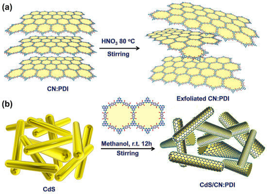 The CdS nanorods were synthesized via a hydrothermal reaction of CdCl2·2.5H2O and thiourea in an autoclave as described in the literature [43,44]. Thermal condensation polymerization of dicyandiamide at 550 °C was used for the synthesis of CN containing fused tris-s-triazine (heptazine, C6N7) units [45,46]. Bulk PMDA units incorporated CN (CN:PDI) semiconductor polymer was synthesized by thermal annealing of PMDA and melem (2,5,8-triamino-s-heptazine; C6N7-(NH2)3) [47] at 425 °C for 12 h. Since the bulk CN:PDI synthesized using an equimolar mixture of PMDA and melem has been reported to exhibit the highest photoactivity, we used CN:PDI equimolar units containing catalyst throughout this study [24,48]. The bulk CN:PDI was transformed into few-layered CN:PDI by proton-assisted exfoliation using conc. HNO3 at 80 °C (Figure 1a) [29]. The protons furnished by HNO3 can protonate strand nitrogens (NH/NH2) on CN:PDI to form ammonium-type local sub-structure which breaks intersheet hydrogen bonding resulting in the exfoliation of π-stacked sheets [17,49]. Further, strongly oxidizing nitrate ions (NO3−) partially oxidize sheets promoting mutual repulsion and exfoliation of sheets. The obtained Exf. CN:PDI sheets were washed with water and redispersed in methanol. The CdS/CN:PDI heterojunction in which the CdS nanorod core was enwrapped with CN:PDI sheets was achieved via the mixing of CdS and Exf. CN:PDI suspension in methanol for 12 h. The average size(s) of CdS, Exf. CN:PDI and CdS/CN:PDI were determined to be 190, 270 and 472 nm, respectively, as determined using dynamic light scattering (DLS) (Figure S2). The increased hydrodynamic radius of CdS after coupling with CN:PDI demonstrates that CN:PDI nanosheets successfully wrapped around CdS nanorods in CdS/CN:PDI.