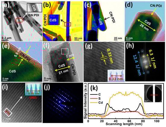 The structural attributes of the synthesized samples were determined using high-resolution transmission electron microscopy (HR-TEM) (Figure 2a–h and Figure S1). The HR-TEM images of CdS/CN:PDI at a relatively low magnification (200 nm scale bar) display bundles of CdS nanorods (Figure 2a). The magnified view clearly shows the presence of CN:PDI wrapped around the CdS nanostructure. The color map TEM images of CdS/CN:PDI at 50 and 20 nm scale bars clearly show distinct wrapping of CN:PDI on CdS nanorods (Figure 2b,c). The high-resolution TEM image at a 5 nm scale bar shows that the diameter of the CdS nanorods was between 21 and 26 nm with a 5–7 nm coating of CN:PDI (Figure 2d–f). The CdS lattice fringes with a d spacing of 0.33 nm were clearly evident in TEM images (Figure 2g). It is interesting to note that CdS and CN:PDI have a similar 0.33 nm lattice spacing, and thus a clear distinction between CN:PDI and CdS interface lattice planes at their interface is not possible. However, identical lattice fringes for a sparse and dense area in TEM images indicate the highly crystalline nature of wrapped CN:PDI. FFT of the interface between the sparse layer of CN:PDI and CdS demonstrate two sharp spots at 6.3 1/nm (0.32 nm) due to 002 planes and 12.4 1/nm (0.16 nm) due to overlapped planes (Figure 2h). Further, the TEM image at 600x magnification and 2 nm scale bar shows an atomic column of CdS, revealing the highly ordered and crystalline nature of CdS nanorods (Figure 2i) [50]. The calculated interplanar distance of these columns was determined to be 0.33 nm, and was assigned to 002 planes of CdS. The selected area electron diffraction (SAED) pattern displayed bright diffraction spots due to (002), (112) and (110) demonstrating the excellent crystallinity of CdS nanorods (Figure 2j) [51]. To prove that CN:PDI was wrapped all around the nanorods, electron energy loss spectroscopy (EELS) to measure the intensity of C K-edges, Cd M-edge and S L-edges energy loss was used (Figure 2k). The EELS line scan across the diameter of nanorods clearly shows a strong distribution of Cd and S due to the presence of CdS core while a weak signal of carbon with a relatively higher intensity at edge validates the presence of CN:PDI wrapped around CdS nanorods.