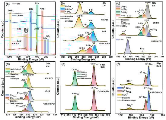 The surface chemical nature and binding energies of constituting elements were determined using X-ray photoelectron spectroscopy (XPS) (Figure 3). The low-resolution XPS survey of materials contained all the core level and the sub-core-level peaks of constituent elements in CN (C1s, N1s, O1s, OKLL), CN:PDI (C1s, N1s, O1s, OKLL), CdS (Cd3d, S2p, Cd3p) and CdS/CN:PDI (C1s, N1s, O1s, Cd3d, S2p, Cd3p, OKLL) (Figure 3a). The high O1s peak intensity in CN:PDI XPS suggests incorporation of C=O containing PMDA units. The XPS quantification considering the relative sensitivity factor is provided in Table S1. The high-resolution (HR) XPS spectra of CN in the C1s region was deconvoluted into three peak components centered at binding energy values of 284.8, 286.2 and 288.3 eV. The peak at BE 284.8 eV originated from sp3 hybridized C-C turbostratic adventitious carbons while XPS peaks at 286.2 and 288.3 eV were assigned to tertiary (N-(C)3) and secondary (N-C=N) carbons of sp2 hybridized heptazine nucleus (C6N7) composing the carbon nitride framework (Figure 3b) [30,52]. The Exf. CN:PDI polymer sheets synthesized in this work also demonstrated three peak components in the C1s region located at the same BE value due to sp3 hybridized (C-C), sp2 hybridized tertiary (N-(C)3) and secondary (N-C=N) carbons. From the C1s XPS spectra of Exf. CN:PDI, it can be seen that the intensity of the sp3 hybridized (C-C) peak component was increased which was attributed to the contribution of carbons present in pyromellitic diimide (PDI) units. The CdS showed three C1s peaks at 284.8 (C-C), 286.2 ((N-(C)3) and 288.2 (N-C=N carbons) eV due to residual organic precursor/their hydrothermal products used in the hydrothermal synthesis. After wrapping CN:PDI around CdS nanorods, the peak intensities of (N-(C)3) and (N-C=N carbons) increased due to the contribution from CN:PDI. The deconvoluted core level HR-XPS spectra of CN in the N1s region displayed three peak components at BE ≈ 398.6, 399.7, and 400.9 eV (Figure 3c). The XPS peak components at 398.6 and 399.7 eV arose from the secondary C=N–C and tertiary N–(C)3 nitrogens of N-linked heptazine (C6N7) in the CN scaffold while another relatively small peak component centered at 400.96 eV was observed due to residual sp3 hybridized primary nitrogens present at the edge of the sheets (–NH2/NH) (Figure 3c) [53]. A weak signal at the BE ≈ 404.75 eV was observed due to π-π* transition in the conjugated CN system. Besides these three peak components, an additional peak at 398.3 eV due to polyimide bond nitrogens (N < (CO)2) was also observed in the XPS spectra of CN:PDI. Furthermore, the π-π* transition peak for CN:PDI was observed at a relatively high binding energy (406.42 eV) along with increased intensity. The increased binding energy occured due to the electron-withdrawing effect of electron-deficient PMDA units which increased the bandgap due to band edge shifting resulting in high energy π-π* transition in harmony with the previous reports [54]. Further, the addition of aromatic rings containing PMDA units in the CN:PDI structure enhanced the degree of conjugation which resulted in increased peak intensity. Unfortunately, the N1s signals in XPS spectra of CdS/CN:PDI were suppressed due to an intense Cd3p peak at 404.90 eV coinciding in the same region, and only a very small N1s peak was observed. The peak deconvolution of the O1s peak of CN revealed two peak components at 531.71 and 533.07 eV (Figure 3d). The peaks at 531.71 eV originated from the C=O/N-C-O oxygens in the residual uncondensed CN structure, while the shoulder peak at 533.05 eV was assigned to -OH of adventitious oxygen/moisture (Figure 3c). The C=O/N-C-O oxygens and -OH peaks were also present in HRXPS of CN:PDI, and C=O/N-C-O peaks were shifted slightly toward high BE due to the electron withdrawing effect of PMDA [55]. The O1s spectra of CdS also show two peaks at 531.6 and 532.8 eV due to surface-oxidized oxygens present in SO42−/O2− state oxygens and surface-adsorbed -OH oxygens [56]. The HR-XPS spectra of CdS and CdS/CN:PDI in the Cd3d region showed two well-separated XPS peaks at 404.9 and 411.7 eV assigned to Cd3d5/2 and Cd3d3/2 peak components of Cd present in +2 oxidation state of CdS (Figure 3e) [12]. Furthermore, core-level HR-XPS spectra of CdS and CdS/CN:PDI in the S2p region demonstrated three deconvoluted peaks located at BE values 161.3, 162.5 and 168.5 eV (Figure 3f). The major strong peak at 161.3 eV and adjacent shoulder peak at 162.5 eV were assigned to S2p3/2 and S2p1/2 peak components of sulfide (S2−) ions present in the CdS crystal structure [57] while a less intense peak at 168.5 eV originated from surface-oxidized S atoms present in sulfate form (SO42−) [58]. The BE value for Cd3d and S2p peak remains unchanged after the wrapping of CN:PDI suggests the absence of any ionic interaction and substantiating the presence of a pure Van der Waals interaction between CdS and CN:PDI.