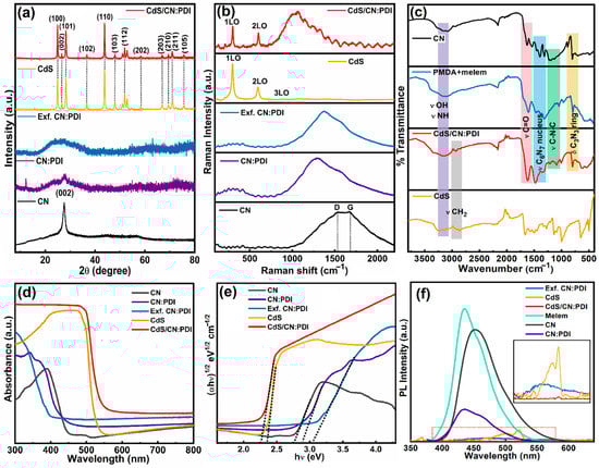 (a) XRD diffraction pattern, (b) Raman spectra, (c) FTIR (d) DR-UV–Vis spectra (e) Tauc plot and (f) steady-state PL spectra of CN (black), CN:PDI (violet), Exf. CN:PDI (blue), CdS (yellow) and CdS/CN:PDI (red).