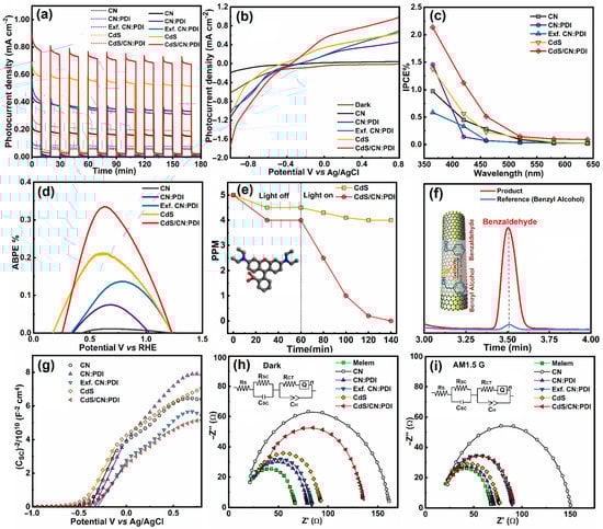 (a) Photocurrent vs. time (i-t) plot showing photoresponse during light On–Off cycle at +0.6 V under solar-simulated AM1.5G light irradiation without filter (100 mW cm−2) with and AM1.5G light irradiation with a 420 nm cut-off filter. (b) LSV showing photocurrent density with respect to the applied voltage and (c) IPCE% vs. wavelength action spectra under 365, 420, 460, 520, 580, 640 nm wavelength LEDs (21.0 mW cm−2). (d) ABPE% showing maximum photoconversion efficiency (PCE%) under AM1.5G light irradiation without filter (100 mW cm−2) for CN, CN:PDI, Exf. CN:PDI, CdS, CdS/CN:PDI. (e) Photocatalytic degradation of RhB using CdS (yellow), CdS/CN:PDI (red) under AM1.5G light, (f) HPLC chromatogram of pure BA (blue) and the reaction product of photooxidation of BA showing the peak of BAL (red) using CdS/CN:PDI as a catalyst. (g) Mott–Schottky plot showing flat band potential. (h) EIS Nyquist plot under dark and (i) under AM1.5G irradiation. Inset showing Randles equivalent circuit. All the measurements were performed in 0.1 M Na2SO4 solution at a scan rate of 0.1 mV/s. Color: CN (black), CN:PDI (violet), Exf. CN:PDI (blue), CdS (yellow), CdS/CN:PDI (red).
