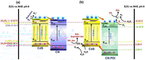The band diagram displays the flow of electrons in (a) CdS/CN (b) CdS/CN:PDI.
