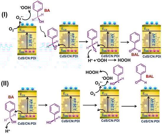The photooxidation of BA to BAL is triggered by the absorption of photons by CdS/CN:PDI and the generation of electron–hole pairs. The generated electrons and holes can initiate the oxidation of BA to BAL. Depending upon the first involvement of electrons or holes, the oxidation of BA to BAL can occur via two routes: (I) e−/O2•− initiated O–H cleavage, and (II) h+ initiated C–H cleavage as shown in Figure 7 [76,77,78]. In route I, the generated electrons react with oxygen to generate O2•− radical. The O2•− radicals are very reactive and abstract a proton from the surface-adsorbed BA forming hydroperoxyl radical (•OOH) and benzyloxide anion (PhCH2O:−). These Ph(OH)CH:− anions react with holes in the VB and form benzyloxide radical (PhCH2O•) which further reacts with the hole and •OOH radical to finally produce BAL and H2O2. In route II, the holes react with BA resulting in the abstraction of a proton by cleavage of the C-H bond to form a radical (Ph(OH)CH•). These radicals react with superoxide anion radical (O2•−) generated on the CB of the materials to form hydroperoxyl radical (•OOH) and BAL by proton abstraction. The •OOH radical reacts with protons and electrons to form H2O2. The comparison of CdS/CN:PDI photocatalytic activity for BA to BAL conversion with previously reported state-of-the-art catalysts are listed in Table S3 which depicts CdS/CN:PDI possess a promising performance (Table S4).