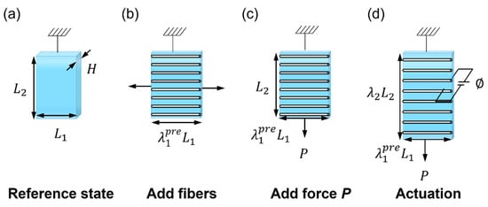 The fiber-constrained planar PVC gel planar actuator. (a) In the reference state, the membrane is not stretched. (b) The membrane is pre-stretched in the horizontal direction, and fibers are added. (c) A force is applied in the vertical direction so that the vertical direction returns to its original length . (d) The membrane is subjected to both force and voltage .