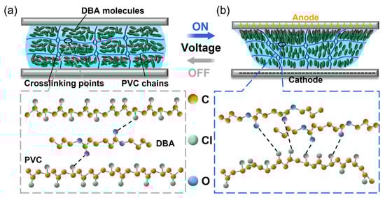Internal structure of PVC gel. (a) Before the voltage was applied, DBA was evenly dissolved inside the gel. (b) After the voltage is applied, the DBA migrates to the anode, resulting in creep deformation owing to interaction with the PVC chains.