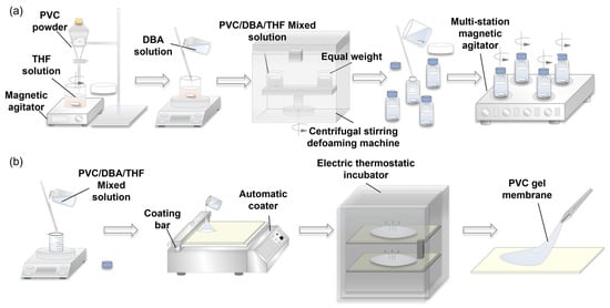 Preparation of PVC gel membranes: (a) preparation of PVC/DBA/THF mixed solution and (b) preparation of PVC gel molding by coating method.