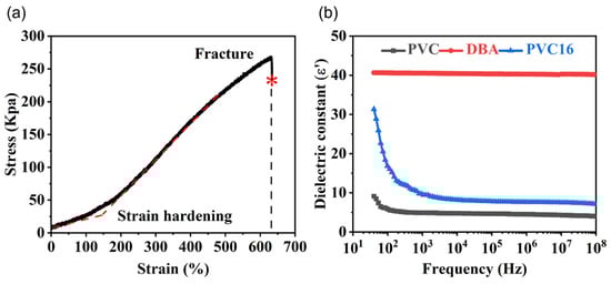 Experimental results of PVC16 gel membranes. (a) Uniaxial tensile test results: stress–strain curves. The asterisk is the uniaxial tensile fracture point of PVC gel. The red dashed line shows the change of elastic modulus of PVC gel. (b) Dielectric constants of PVC, DBA, and PVC16 as functions of the frequency.