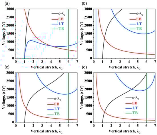 According to the proposed model, we can explore the deformation mechanism of planar actuators under different horizontal pre-stretches and reveal the allowable range, electrical breakdown limit, and mechanical failure limit of the actuators. Under different horizontal pre-stretches (Figure 9), the black curve () represents the actuator deformation curve predicted by the model, which can predict the strain value of the actuator under different voltages. The red curve (EB) represents the electrical breakdown strength of PVC gel. The blue curve (LT) represents the tension loss condition and the allowable range of the actuator under the blue curve. In theory, the intersection points of the black and red curves represent the maximum strain that can be obtained by the actuators. Maximum strains of 31.5%, 22.5%, 20.7%, and 25% can be generated by the four types of actuators with different horizontal pre-stretches at 2280, 1224, 816, and 600 V, respectively. In general, with the increase in horizontal pre-stretching, planar actuators can achieve relatively large deformations under lower voltages, which is the key to improving the performance of planar actuators. However, as the horizontal pre-stretch increases, the PVC gel becomes thinner, so electrical breakdown will occur at lower voltages, and the conditions for horizontal tension loss will expand with the increase in pre-stretching. The mechanical failure limit is defined as the uniaxial tensile limit fracture rate (d) and, therefore, is set to a constant value in the vertical direction.