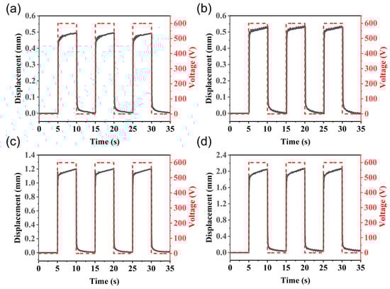 Displacement of four different horizontally pre-stretched planar actuators at 600 V, 0.1 Hz: (a) , (b) , (c) , and (d) .