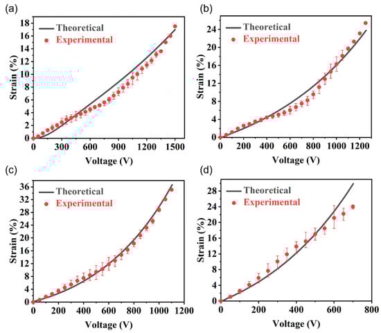 Because the electric breakdown field strength set by our theoretical model is a fixed value, it can only preliminarily predict the deformation of fiber-constrained planar actuators in the general range. However, in the actual testing process, we found that the electrical breakdown strength differed under different horizontal pre-stretches. We substituted the electrical breakdown strength measured in the experiment and the deformation data before the electrical breakdown into the new model and performed parameter fitting of the model, as shown in Figure 12. The polarization limits set by theoretical deformation under 0%, 100%, 200%, and 300% horizontal pre-stretch were 5.3 × 10−4, 1.3 × 10−4, 8 × 10−5, and 1.2 × 10−4, respectively. The breakdown voltages of 0%, 100%, 200%, and 300% horizontal pre-stretch were 1500, 1200, 1100, and 700 V, respectively. The theoretical and experimental deformations corresponding to the vertical direction were 17.0, 23.6, 36.4, 29.9, 17.5, 25.4, 35.1, and 24%, respectively. The theoretical results are in good agreement with the experimental results. Moreover, it can be seen that the variation trend of the theoretical curve is consistent with that of the actual test data. The higher the voltage growth, the faster the deformation growth. The new model and the overall theory are in good agreement with the actual situation. As shown in Figure 12c, the theory of a 200% horizontal pre-stretch was the most consistent with the experiment. This is because the Gent model and hyperbolic tangent function are used in our model mainly to characterize the nonlinearity of the PVC gel deformation. The Gent model will enhance the nonlinearity with the increase of gel deformation; that is, the larger the pre-stretching amount, the stronger the nonlinearity. The 200% horizontal pre-stretch group could measure the most complete experimental data, and the breakdown value measured in the experiment was the closest to the predicted breakdown value of the original model. Therefore, when parameter fitting was performed, the fitting value was the best, and the trend linearity was the most consistent. The relative nonlinear degree of the driving curve before breakdown predicted by the original model for the 0% and 100% groups was low, and the fitting with the nonlinear data measured by the experiment was poor. In addition, the samples of the 300% group broke down very early in the experimental test, and the breakdown intensity was far lower than the fixed value set by the model and, therefore, did not fit well.