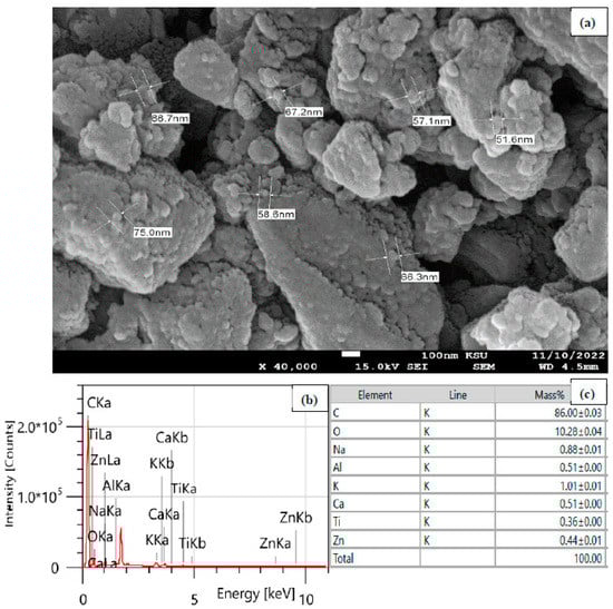 The SEM examination was used to analyze the morphology of the MUCNPs’ surfaces. Figure 1a shows the SMCNPs SEM results, which possessed particles of sizes ranging from 52.4 to 75.0 nm. Additionally, the EDX was utilized to examine the elemental composition of the MUCNPs (Figure 1b,c). The commercial MC was composed mainly of carbon (86.0%) and trace amounts of aluminum, potassium, calcium, titanium, and zinc.
