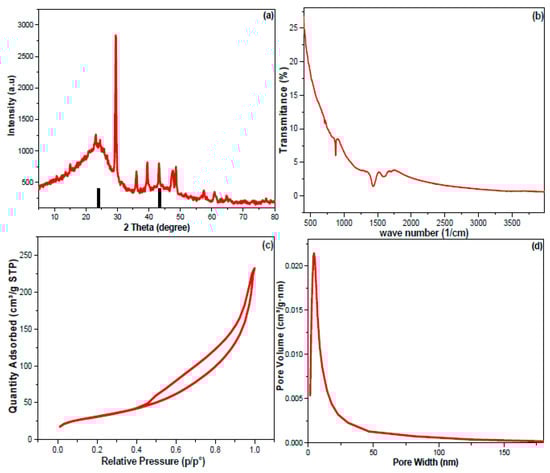 (a) XRD, (b) FT-IR, (c,d) the N2 adsorption–desorption results of the produced MUCNPs.