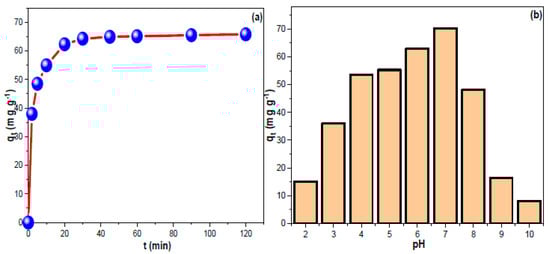 (a,b) The impact of contact time and the influence of pH on CHDNG sorption by MUCNPs.