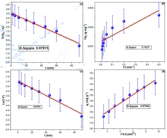 Equation (1) was used to determine the adsorption capacity, expressed as the milligrams of CHDNG that may be adsorbed onto one gram of MUCNPs (qt, in mg g−1). In order to investigate the adsorption rate, the pseudo-first-order (PF) and pseudo-second-order (PS) kinetic models (Equations (2) and (3)) were utilized. Furthermore, the liquid-film diffusion model (LD, Equation (4)) and the intraparticle diffusion model (ID, Equation (5)) were used in order to investigate the adsorption step that is present in adsorption [60,61].