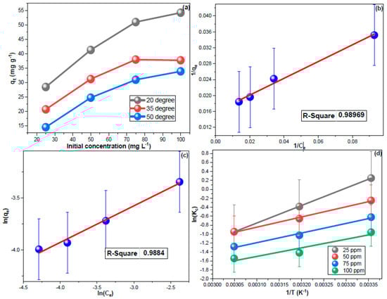 The impact of CHDNG concentration on its removal by MUCNPs was investigated (Figure 5a). The experimental qt increased proportionally as the feeding concentration increased, indicating that a 1:2 sorbent-to-solution ratio can effectively treat a 100 mg L−1 CHDNG pollution [59]. These obtained results implied the applicability of MUCNPs to remediate industrial wastewater and contaminated water resources. Further, the results of sorption equilibria from different CHDNG concentrations were utilized for the adsorption isotherm investigations. The adsorption isotherms have been studied using the Langmuir (LM, Equation (6)) and Freundlich (FM, Equation (7)) as the most widely applied isotherm models.