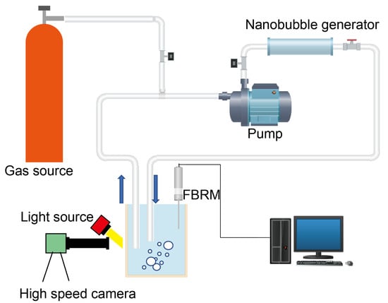 Several techniques requiring high energy input have been developed to produce a large number of micro/nanobubbles, such as electrolysis [], hydrodynamic cavitation [,] and ultrasound [,]. The swirling-flow nanobubble generator is an efficient hydrodynamic cavitation method that can continuously produce enormous quantities of bulk nanobubbles. Although many previous studies characterize nanobubbles, microbubbles produced concurrently by a nanobubble generator have been largely neglected. These micron-sized bubbles may play a crucial role in the evolution of nanobubbles. Techniques such as high-speed imaging, DLS and focused beam reflectance measurement (FBRM) have been applied to study bulk bubbles. Among them, FBRM is particularly useful for analyzing the size and number distribution of small particles by analyzing the reflected laser signals [,,,,], while DLS measures the scattering intensity from suspended objects ranging from a few nanometers to several micrometers.
