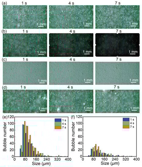 Figure 2c presents the bubbles generated during the water treatment process with the addition of detergent. The addition of detergent results in a homogeneous and opaque background. Distinct from that in Figure 2a where the generated bubbles were easily distinguishable from the background, the bubbles are difficult to distinguish from the surrounding environment in Figure 2c due to the high number of bubbles produced. The higher density of these bubbles scatter light strongly. Bubbles generated with the addition of oil are shown in Figure 2d. The background looks similar to that in water shown in Figure 2a. However, the number density of bubbles is much lower and the size of bubbles is comparatively larger.