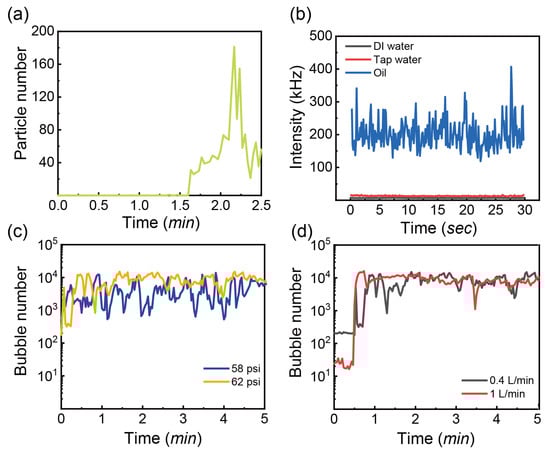 (a) Particle number (<10 m) as a function of time without treatment, (b) Intensity signal of Milli-Q water, tap water and oil as a function of time at room temperature, (c) CO2 bubble number (<10 m) as a function of time at the gas flow rate of 0.4 L/min and pressure of 58 and 62 psi, (d) CO2 bubble number (<10 m) as a function of time at the gas flow rate of 0.4 and 1 L/min and pressure of 62 psi.