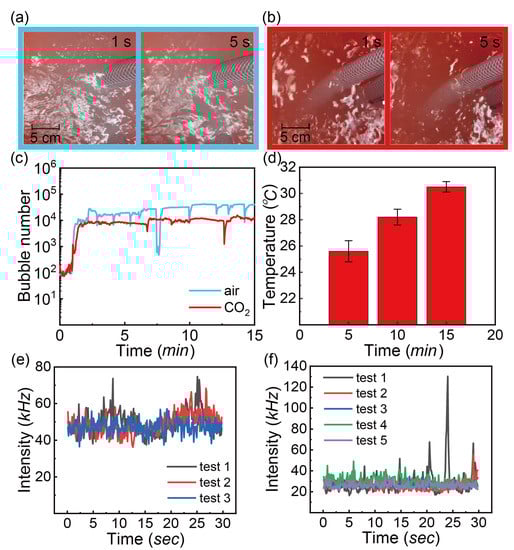 The observation of water with the treatment of nanobubble generator at gas flow rate of 0.4 L/min and pressure of 62 psi: (a) air injection; (b) CO2 injection; (c) Bubble number (<10 m) as a function of time with injection of air and CO2; (d) the real-time temperature of tap water with CO2 injection at 5, 10 and 15 min; the intensity of scattered laser as a function of time: (e) air injection; (f) CO2 injection; test 1 starts from 0 min and the gap of each test is 5 min.