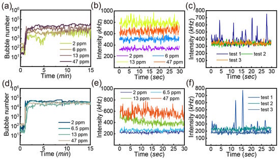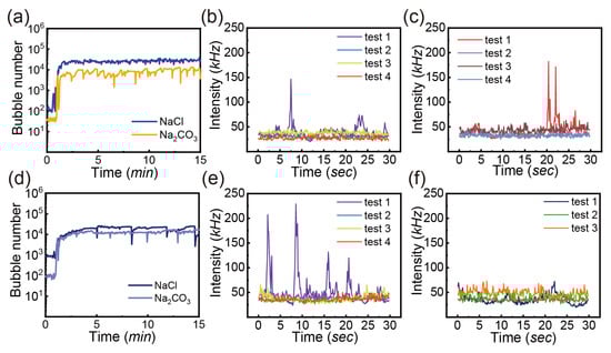 For air bubbles shown in Figure 5a–c, the bubble number in the NaCl solution is relatively constant over time, on the same order of magnitude as the bubbles in water without additives (Figure 4c). However, the bubble number in the Na2CO3 solution is consistently lower than that in the NaCl solution. Figure 5b,c shows the scattering intensity from NaCl and Na2CO3 solutions. Apparently, the scattering intensity is relatively constant (25–50 kHz), slightly weaker than that from water shown in Figure 4f. The scattering intensity does not support that the salts may stabilize small air bubbles.