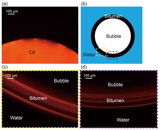 (a) Microscopic observation of dyed oil drop on the substrate, (b) sketch of oil-coated bubble; oil layer at two positions of the bubble are shown in (c,d).