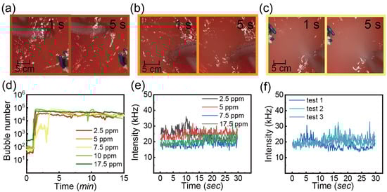 The last additive is a commercial detergent at different concentrations. As seen in Figure 8a–c, the foam layer floated at the top of the water and the thickness of foam increases with the detergent concentration from 2.5 ppm to 20 ppm. Figure 8d presents the bubble number (<10 m) as a function of time with various detergent concentrations. At the lowest concentration of 2.5 ppm, there is no significant enhancement in bubble generation compared to the air bubble number in water, as shown in Figure 8c. However, the bubble number increases rapidly with an increase in the detergent concentration to 5 ppm. No further increase in the bubble number was observed by further increasing the detergent concentration.