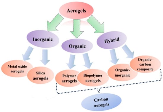 Several approaches have been used to classify aerogels based on their material forms (monoliths, granules, powders, and films), chemical composition (organic, inorganic, and hybrid), and microstructure (microporous, mesoporous, and macroporous). Different forms, compositions, and microstructures can offer different applications for and greater functionality of aerogels. The present review provides a panorama of aerogels based on their composition. Aerogels can be essentially divided into three categories: inorganic (metal and metal oxides), organic (synthetic polymers and biopolymers), and organic–inorganic hybrid materials (Figure 1). Carbon aerogels are another important class of aerogels with different physical properties that are obtained from pyrolysis of organic and organic and inorganic composite aerogels. Carbon aerogels are characterized by excellent thermal and electrical conductivity, high porosity, and high specific surface area (>2000 m2/g). A good introduction to carbon-based aerogels can be found in the literature [1,2,3,4,5].
