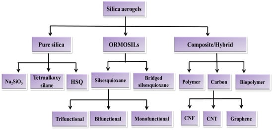 Inorganic aerogels were the first widely studied aerogels and have been applied the most [6,7]. Nearly all metal alkoxides are known to form porous aerogels. Synthesis of metal oxide aerogels (titanium, zirconium, tin, aluminum, etc.) with different geometries has been comprehensively reviewed by Sui and Charpentier [8]. Among the inorganic, silica aerogels are the most widely studied commercially important class of material, and enjoy exclusive attributes such as high porosity, large surface area, and exceptionally low thermal conductivity [9,10,11]. The choice of precursors helps to control the properties of the final materials, thus leading to products with tailored physical and chemical properties. Overall, silica aerogels are divided into three categories derived from (1) pure silica, (2) organically modified silicas (ORMOSILs), and (3) organic–inorganic composite aerogels as illustrated in Figure 2.