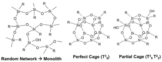Among the family of hybrid aerogels, silsesquioxane are based on compounds with RSiO1.5 repeat units, and this group has grown dramatically [67,68,69]. The first commercialization of silicones began with silsesquioxane chemistry. Silsesquioxanes derived from trifunctional silanes structurally exhibit siloxane networks or cages with varied pendent groups (Figure 4). Typically, there are two types of materials: polymers based on random networks (T resins) and oligomeric molecules known as polyhedral oligosilsesquioxane (POSS). The structures of monofunctional (R3SiX, X = alkoxy, halogen, etc), difunctional (R2SiX2), and trifunctional (RSiX3) organosilane used in the preparation of silsesquioxane are described in Scheme 3. All these precursors are characterized by the presence of Si–O covalent bonds. The network material can be formed from RSiX3 via condensation with tetrafunctional monomers such as TEOS or TMOS. The resulting morphology of hybrid material is modulated via RSiX3/TEOS ratio. Due to high thermal and mechanical stabilities with variable porosity, silsesquioxanes are used in various applications such as ionic liquids [70], organic semiconductors for electronics [71], electrolytes for lithium ion batteries [72], water desalination [73], gas/liquid phase separation [74], and optical materials [75].