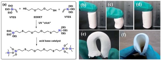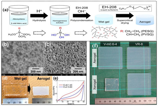 Alternatively, organotrialkoxysilanes with longer alkyl groups (ethyl, vinyl, and propyl) are used to prepare aerogels. Itagaki et al. have investigated the phase separation behavior by varying the molar ratio of VTMS and TMOS as co-precursors in the presence of formamide under an acidic condition and prepared monolithic amorphous alkylsiloxane gels with well-defined macropores [126]. Shimizu et al. developed transparent hydrophobic polyethylsilsesquioxane (PESQ) and polyvinylsilsesquioxane (PVSQ) aerogel using ETMS and VTMS precursors in the presence of nonionic surfactant EH-208 (polyoxyethylene 2-ethylhexyl ether) [127], as represented in Figure 6. Micrographs clearly show a thick gel skeleton with large pores (100 nm), and the presence of a coarsened porous structure causes visible-light scattering. Typical stress–strain curves of PESQ aerogels are presented in Figure 6e, which exhibits flexible behavior on uniaxial compression of up to 50% without collapse. The mechanical properties of PVSQ aerogels are further strengthened by radical polymerization of vinyl groups in the solid network using AIBN radical initiator. These aerogels had the desired transparency and compressibility. However, the density was high and they possessed low elastic modulus.