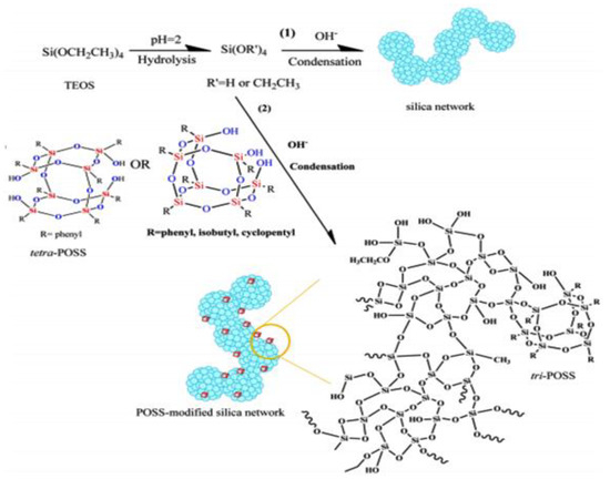 Formation of unmodified silica networks (path 1) and modification of silica networks by POSS molecules (path 2). Reprinted with permission from Ref. [133]. Copyright 2012 American Chemical Society.