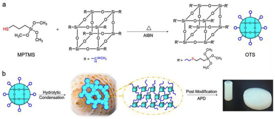 Polyhedral oligomeric silsesquioxane (POSS) is also used to construct novel organic–inorganic materials. Many research groups have developed unique silica aerogels based on POSS which have resulted in some inspiring improvements to aerogel properties [130,131,132]. Jana et al. evaluated a POSS molecule carrying phenyl, iso-butyl, and cyclohexyl organic side groups as a multifunctional reinforcing agent within the silica aerogel [133]. Schematic illustration of TEOS and POSS molecules are displayed in Figure 7. The compressive modulus increased six-fold with less than 5 wt% trisilanol phenyl-POSS, with negligible increases in density. Recently, Li and coworkers prepared octa [2-((3-(trimethoxysilyl)- propyl)thio)ethyl]silsesquioxane (OTS)-based superhydrophobic aerogels using MPTMS and POSS via thiol-ene click chemistry and studied the effects of OTS:H2O molar ratio on the physical properties of aerogels (Figure 8) [134]. Benefiting from the alternating rigid inorganic nanocage skeleton, the resulting flexible OTS aerogels had high surface area (542–834 m2/g) and high compression strengths (4.96–6.48 MPa), with a better compression modulus (18.79–25.84 MPa). The good oil–water separation efficiency of OTS aerogels can be utilized for practical application.