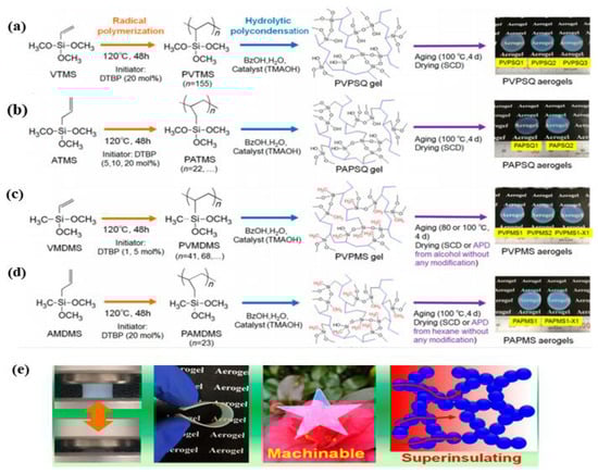 Polyvinylpolymethylsiloxane (PVPMSA) aerogels were reported by Feng et al. using a DTBP initiator and following Zu’s double-cross-linking approach, and they systematically studied the effect of temperature and pressure on the thermal properties [140]. They concluded that the thermal conductivity of PVPMSA aerogels is greatly affected by the temperature. Polyvinylmethyldimethoxysilane (PVMDMS)-reinforced MTMS aerogels were also developed, which showed elastic recovery properties and super high surface area (1479 m2/g), mainly due to the long aliphatic hydrocarbon chain and the presence of excess methyl groups [141]. Furthermore, Park et al. used pre-polymerized VTMS and GPTMS precursors to create a nonparticulate structure through spinodal decomposition phase separation [142,143]. This approach reduced the aging process and offered aerogels with enhanced mechanical properties.
