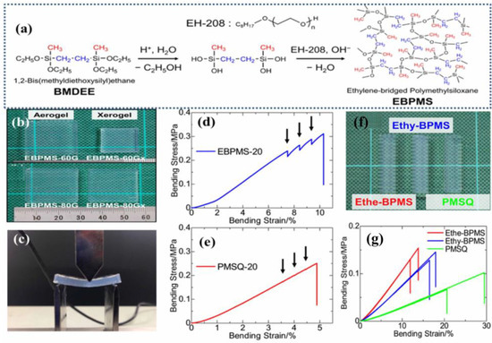 - Shimizu, T.; Kanamori, K.; Maeno, A.; Kaji, H.; Nakanishi, K. Transparent Ethylene-Bridged Polymethylsiloxane Aerogels and Xerogels with Improved Bending Flexibility. Langmuir 2016, 32, 13427–13434. [Google Scholar] [CrossRef]