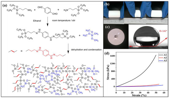 - Yang, Z.; Yu, H.; Li, X.; Ding, H.; Ji, H. Hyperelastic and hydrophobic silica aerogels with enhanced compressive strength by using VTES/MTMS as precursors. J. Non-Cryst. Solids 2019, 525, 119677. [Google Scholar] [CrossRef]
