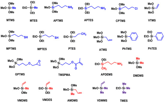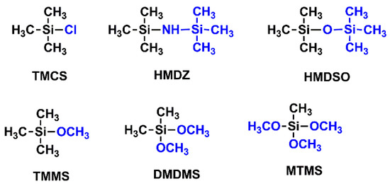 Native silica aerogels are hygroscopic; the residual Si–OH bonds on the silica surface are responsible for their hygroscopic nature. To counteract this, surface modification is required to improve the stability of aerogels. This is normally performed using silane containing hydrophobic organic groups (TMCS, HMDZ, HMDSO, TMMS, DMDMS, MTMS, etc.), which confers a hydrophobic nature to aerogels [13,14,15]. The structures of different silylating agents are represented in Scheme 2. These precursors react with Si–OH on the surface of the wet gel, forming methylsilyl groups. Recently, Rao has reviewed synthesis and applications of silica-aerogel-based silica aerogels [16].