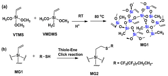 (a) A synthetic scheme for vinyl-modified gels (MG1) from VTMS and VMDMS. (b) Surface modification to add perfluoroalkyl groups (MG2). Reproduced with permission from Ref. [110]. Copyright 2013 Wiley.