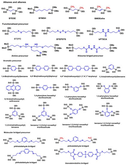 - Shea, K.J.; Moreau, J.; Loy, D.A.; Corriu, R.J.P.; Boury, B. Bridged Polysilsesquioxanes. Molecular-Engineering Nanostructured Hybrid Organic-Inorganic Materials. In Functional Hybrid Materials; John Wiley & Sons: Hoboken, NJ, USA, 2004; pp. 50–85. [Google Scholar]