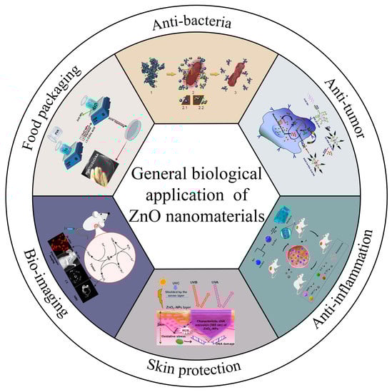 The biological applications of ZnO nanomaterials. Anti-bacteria: Adapted with permission [7]. Copyright 2019, Elsevier B.V. Anti-tumor: Adapted with permission [8]. Copyright 2017, Elsevier B.V. Anti-inflammation: Adapted with permission [9]. Copyright 2022, Frontiers Media S.A. Skin protection: Adapted with permission [10]. Copyright 2022, Elsevier B.V. Bio-imaging: Adapted with permission [11]. Copyright 2017, Springer Nature Switzerland AG. Food packaging: Adapted with permission [12]. Copyright 2020, Elsevier B.V.