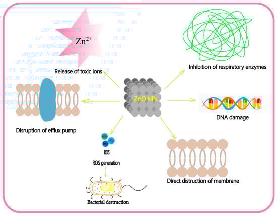 ZnO is currently considered one of the most promising inorganic antimicrobial agents due to its low cytotoxicity, high selectivity and good heat resistance [3]. Although it has certain antibacterial activities, its antibacterial mechanism is not fully understood. To date, the existing view is that ZnO can cause bacterial death through direct damage to cells or indirect generation of ROS to inhibit protein function, destruct nucleic acid and produce harmful lipid peroxidation in bacteria [58]. By searching the literature, we summarize the main antibacterial mechanisms of ZnO nanoparticles as follows (Figure 3): (1) The direct interaction of nanoparticles with bacterial membrane leads to the destruction and rupture of the membrane’s integrity [59]. (2) Generating ROS in the cell to destroy the bacteria [4]. (3) Release of toxic Zn2+ ions to kill bacteria. Zn2+ has a special affinity to bacterial sulfhydryl groups. It can bind and oxidize the groups to inhibit glycolytic enzyme activity, and thereby inhibit the glycolytic pathway [60]. Thus, it can inhibit the action of bacterial respiratory enzymes and eventually lead to cell death. What is noteworthy is that for different types of bacteria, ZnO nanomaterials enter the bacteria in different ways. For Gram-positive bacteria, the Zn2+ in ZnO nanomaterials can be chelated by teichoic acid and lipoteichoic acid of the cell and translocate into cell. For Gram-negative bacteria, it has the porins that act as ion channels to promote passive diffusion into cell. (4) Disruption of the efflux pump and membrane potential on the cell membrane [61]. (5) Internalization of ZnO leads to intracellular DNA damage.