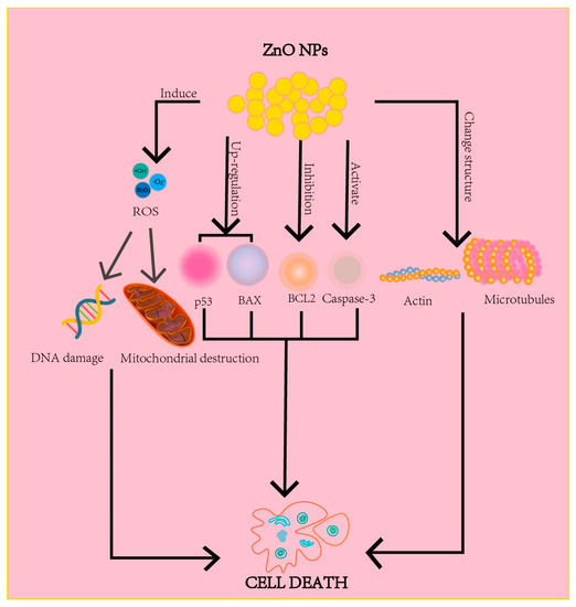 The main mechanisms of ZnO nanomaterials as anti-cancer agents are: (1) Regulating the gene and protein expressions in tumor cells by the internalization of ZnO nanoparticles so as to induce tumor cell apoptosis [86,87,88]. (2) Generating high levels of ROS to induce cell destruction [86,88]. (3) Altering the structure of actin and microtubules to lead to cell necrosis and apoptosis [86] (Figure 4).